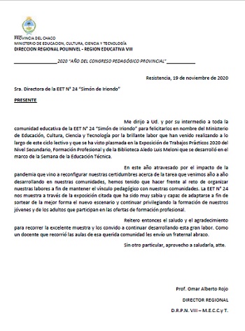 Salutaciones de la D.R.P.N. VIII, a toda la comunidad educativa de la EET N° 24 “Simón de Iriondo” en nombre del Ministerio de Educación, Cultura, Ciencia y Tecnología, por la brillante labor que han venido realizando a lo largo de este ciclo lectivo y que se ha visto plasmada en la Exposición de Trabajos Prácticos 2020 del Nivel Secundario, Formación Profesional y de la Biblioteca Aledo Luis Meloni que se desarrolló en el marco de la Semana de la Educación Técnica.